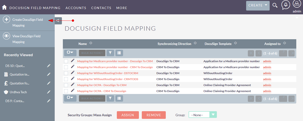 Map the CRM module fields -> to -> DocuSign and DocuSign -> to -> CRM.
