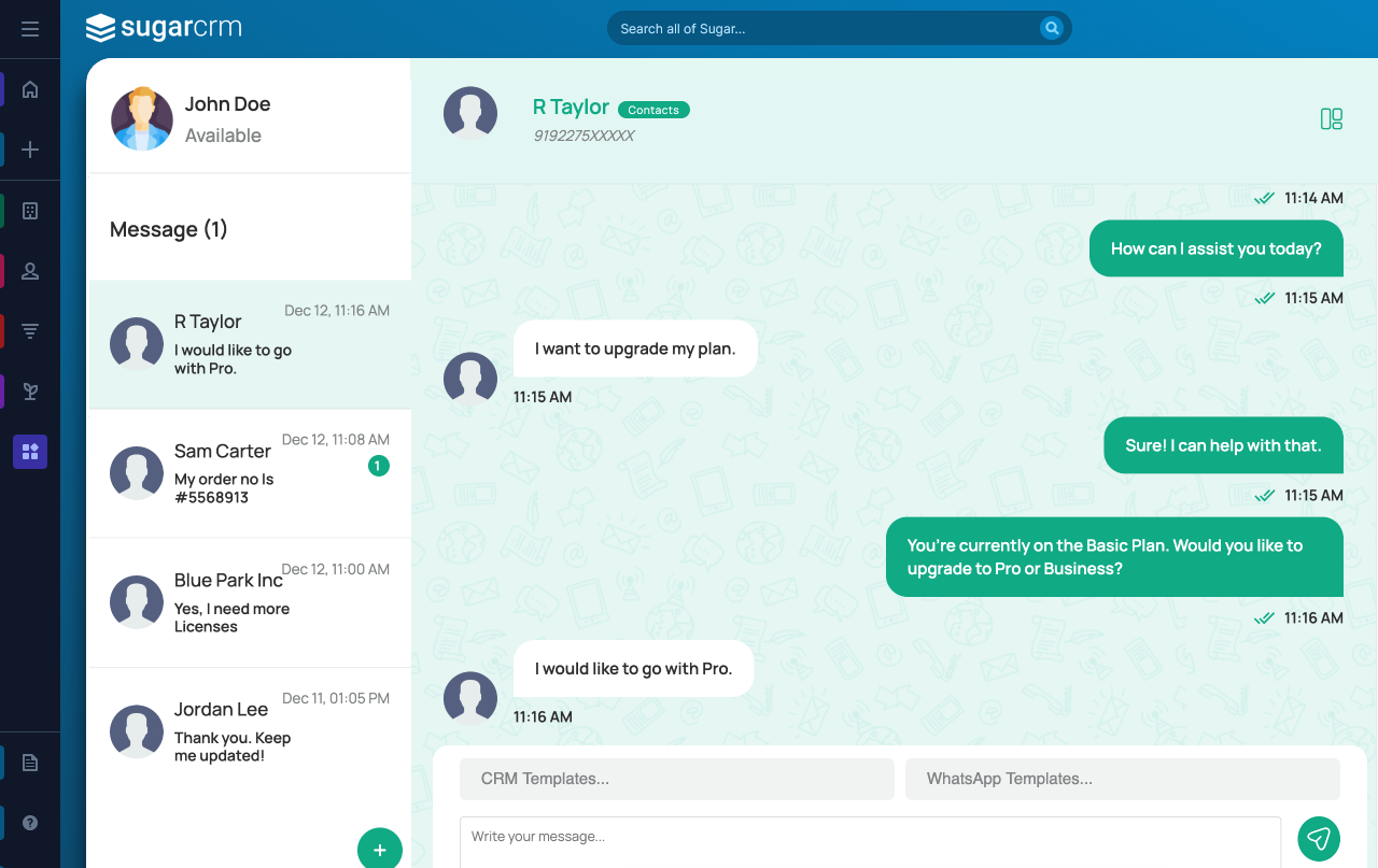 All WhatsApp conversations are stored in SugarCRM, providing a single source of truth for customer interactions across your organization.